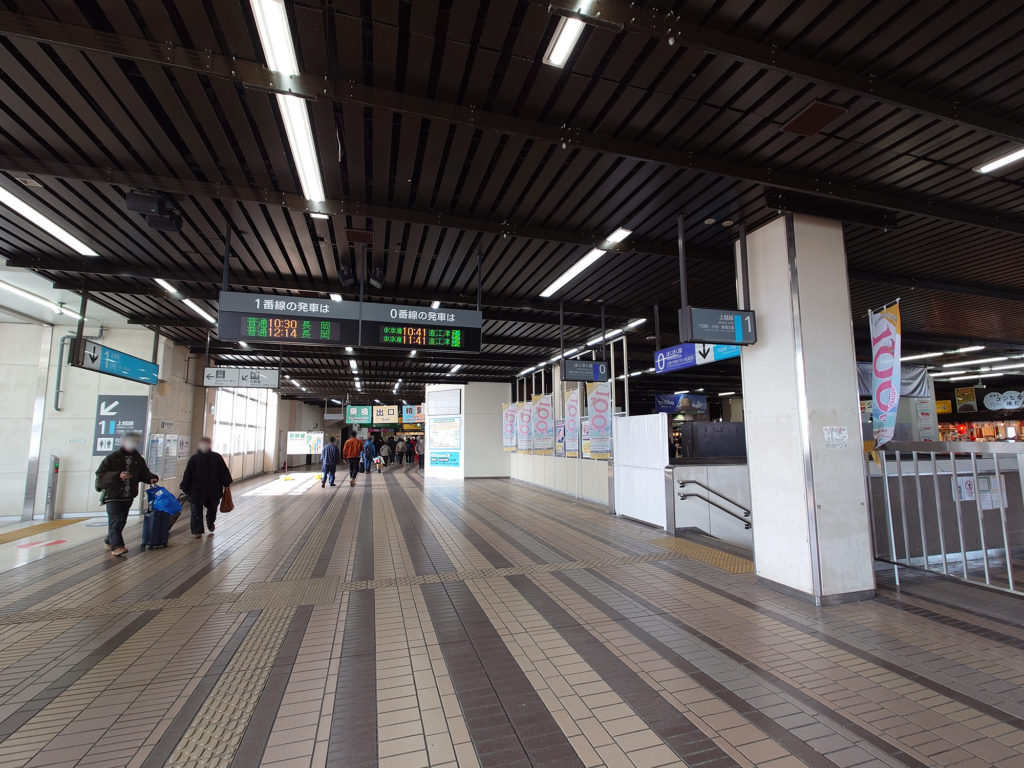駅構内は立体構造となっており、東側に在来線の地上ホーム、西側に新幹線の高架ホームが配置されている。在来線ホームを1階とすると、駅舎および改札階、改札外コンコースの飲食店エリアなどは2階、新幹線ホームは3階に位置する。駅舎は丘陵地に建設されているため、東口前広場は1階、西口前広場は2階の高さにある。