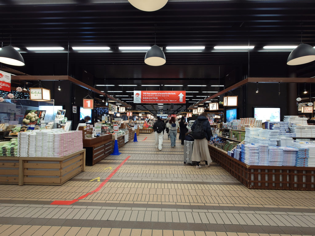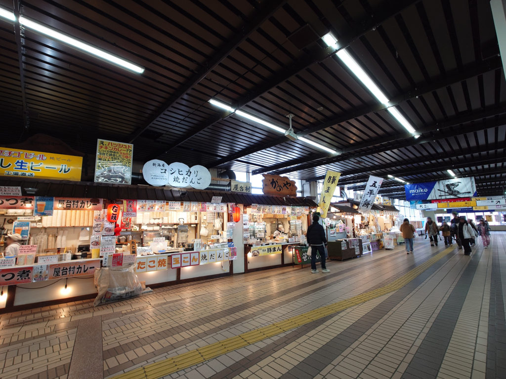 東側方面の自由通路には常設屋台が立ち並んでおり、もつ煮や焼き鳥、豚まんといった軽食を楽しめる。