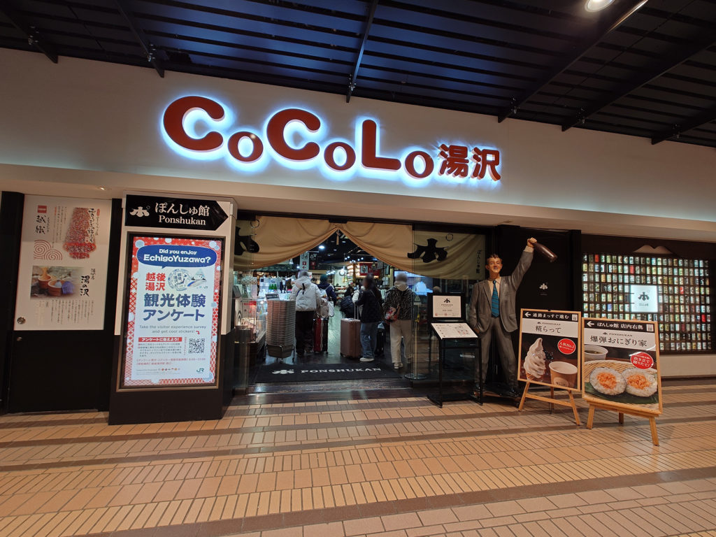 西口駅舎には、駅ビル「CoCoLo湯沢」が入っている。改札外コンコースにあたる「がんぎどおり」には、土産物店や惣菜店、飲食店が並び、観光案内所も設けられている。コンコース北側の本館エリアには、日本酒をテーマとした商業施設「ぽんしゅ館」があり、県内各地の酒蔵から取り寄せた日本酒をはじめ、南魚沼地域の特産品など新潟県内の土産物が販売されている。