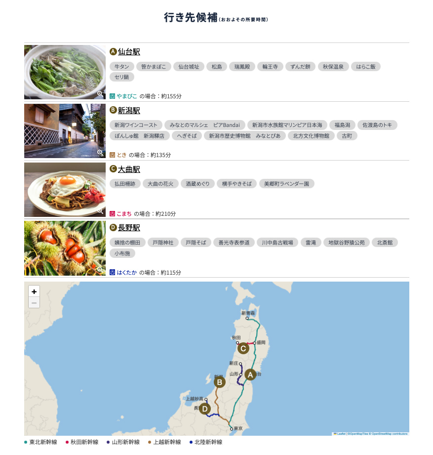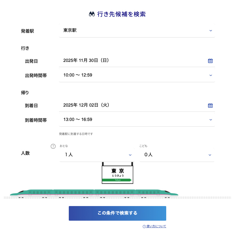- 行き先候補に表示される駅は、日時・時間帯・人数といった検索条件によって制限される場合がある。