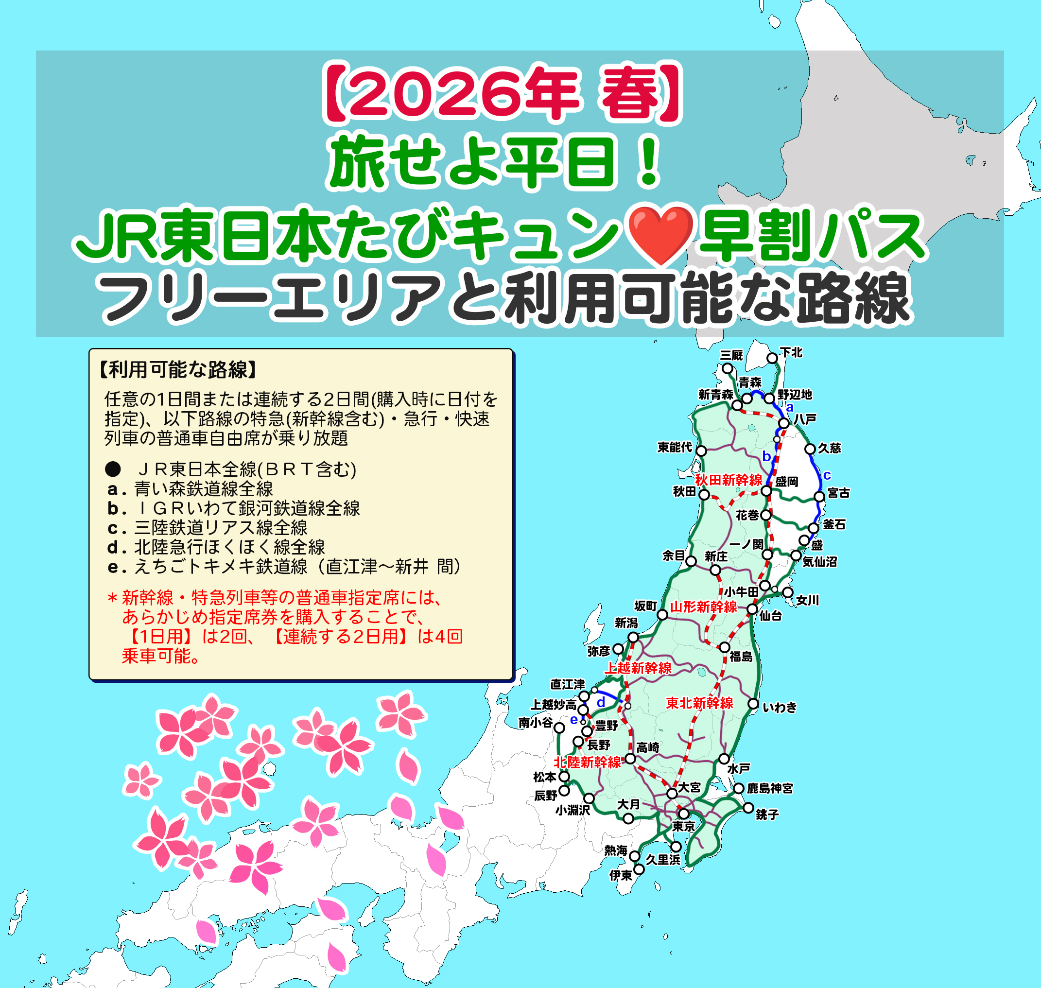 【平日乗り放題】2026年春『旅せよ平日!JR東日本たびキュン早割パス』