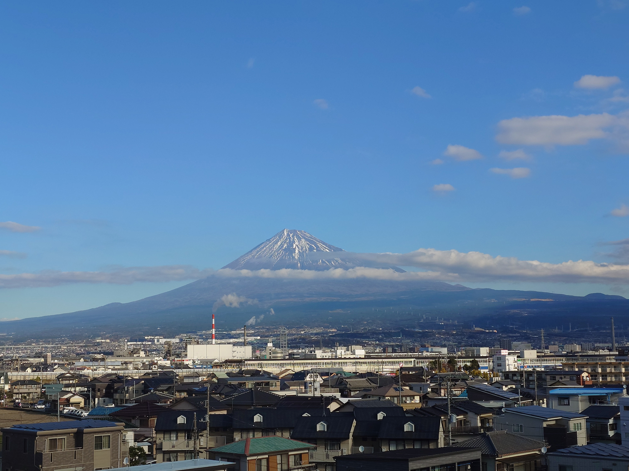 ホテルの窓から外を見ると、雲の間から富士山の頭がうっすらと見えていた。冬の空は澄んでいて、その青さが印象に残る。